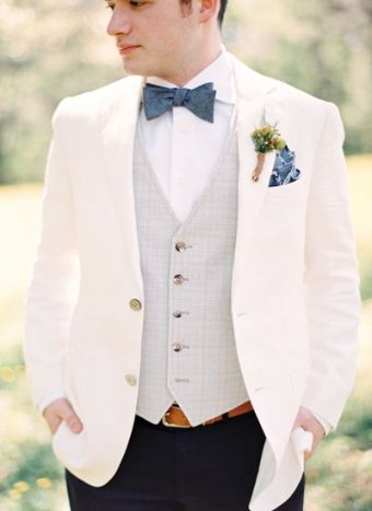The general trend in groomswear has been a combination of informal and individual style. For a classic, timeless and elegant look, a 3-piece suit mixed with a jazzy neck or bow tie and a pocket square will serve the purpose.